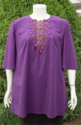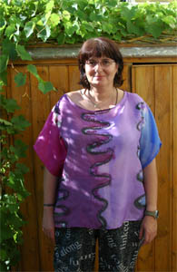 Farben der Erde und des Sonnenuntergangs, Blätter und Gräser als Schattenriß, leichter Schimmer - das sind die Details dieser leger geschnittenen Bluse.