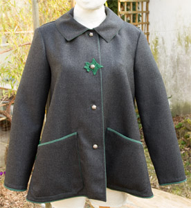 Anthrazitgraue Jacke in A-Form mit rückwärtiger Falte, die zusätzlich für Bequemlichkeit sorgt. Säume und Kanten sind mit grünem Hanfstoff betont. Blickfang ist ein florales Schmuckelement aus Häkelspitze. Echte Silberknöpfe.