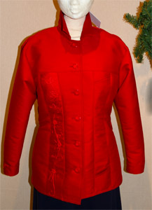 Kräftig rot, geschnitten wie eine Jeansjacke, aber edel aus Woll-Seidenstoff mit handgestickter Bordüre rechts und witzigen kleinen Taschen links. Stickerei an der rechten Ärmelmanschette.