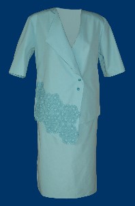 Asymmetrischer Zweiteiler in pastelligem türkis. Das Revers an der rechten Ausschnittseite harmoniert mit der Ton-in-Ton gehaltenen zarten Häkelbordüre. Der schlichte schmale Rock bietet Bewegungsfreiheit durch seitliche Gehschlitze.