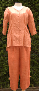 Zweiteiler in terracotta: Oberteil aus Baumwollstoff mit feinen eingenähten Längsfalten und Stickerei mit sehr kleinen Pailletten und Perlen. Locker geschnitten, mit überzogenen Knöpfen.