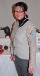 Modell: BF011 - Bluse mit Baum - vorgewaschenes Naturleinen in 2 Schattierungen mit Spitzenärmel: blühender Baum mit Vogel; der Baum ist in naturfarbigen Leinengarnen gearbeitet, der Vogel in Seidengarnen anthrazit - blau - türkis. Grünblau schimmernde Perlmuttknöpfe. Der Spitzenärmel ist rundherum mit Druckknöpfen befestigt und komplett abnehmbar.