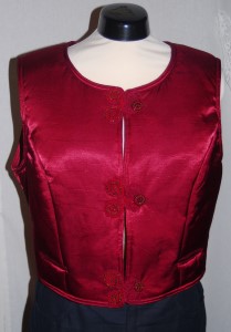Modell: GIL00010 - Rotes Gilet aus "Seidenbarchent", gefüttert und wattiert und mit kleinen Eingrifftaschen vorne; in die zweifarbig roten Verschlußornamente sind rote und honigfarbene Perlen eingearbeitet, auch am rückwärtigen Riegel finden sich entsprechende Ornamente.
