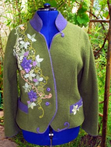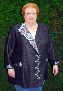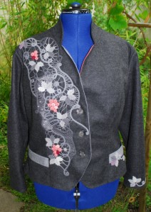 Modell: JK013 - Ein wenig Jugendstil: schwarze Leinenjacke mit Ornamenten in Kupfer-, Rotbraun- und Orangetönen, Glanzpunkte durch Effektgarn.